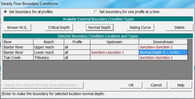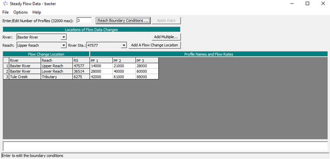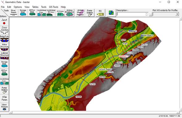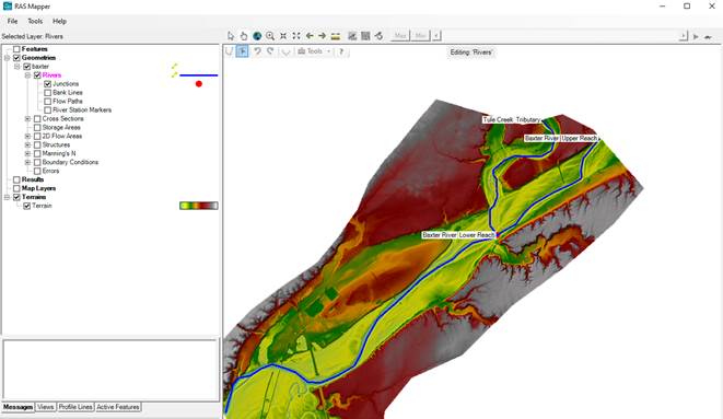 River centerline is used to determine the river network of a HEC-RAS model. Baxter River is flowing from East to West and receives water on the right bank from Tule Creek. Consequently, there are three reaches that are defining the river network: upper Baxter River (Upper reach), lower Baxter River (Lower reach) and Tule Creek Tributary as shown in the Figure below.