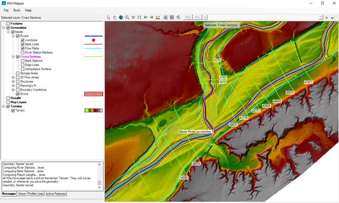 Cross-sections are key inputs to HEC-RAS. Cross-section Xlines (cutlines) are used to extract the elevation data from the terrain to create a ground profile for channel flow computation. It is important to create an adequate number of cross-sections to produce a good representation of channel bed and floodplain.