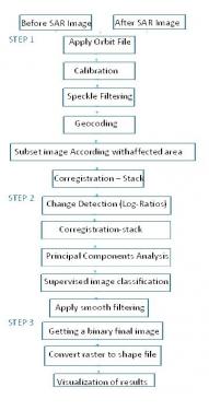 The aim is to identify the area affected by mudslide and associated floods using the backscattering information from "magnitude" SAR data. This step-by-step procedure applies a ratio-change detection technique and principal component analysis using SAR images before and after the dam collapsed.