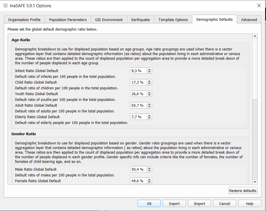Este paso es necesario para adaptar las proporciones de los Defectos Demográficos a los porcentajes de la población local. Cada país tiene diferentes configuraciones demográficas que deben ser consideradas en los pasos siguientes. Como la población de Mozambique es bastante joven, hay más niños que ancianos que en otras partes del mundo. Esto debe considerarse en la planificación del riesgo de desastres. En las configuraciones generales se adaptan los porcentajes como sigue: