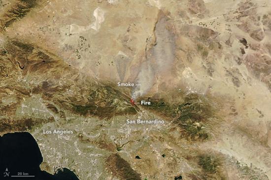 On the 16th of August 2016, the Moderate Resolution Imaging Spectroradiometer (MODIS) on the Aqua satellite of the National Aeronautics and Space Administration (NASA) detected smoke and warm surfaces affecting San Bernardino, California.