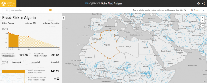 Space-based Information:The Global Flood Analyzer by the World Resources Institute is a tool to analyze flood risks. Parameter estimates for urban damage, affected GDP, affected population, annual expected urban damage and annual avoided urban damage for various three scenarios are visualized. Increased impact due to socio-economic change, climate change and future expected damages (2030) are compared against the base case of current annual expected damage. The scenarios are based upon the 5th Assessment report by the Intergovernmental Panel on Climate Change.