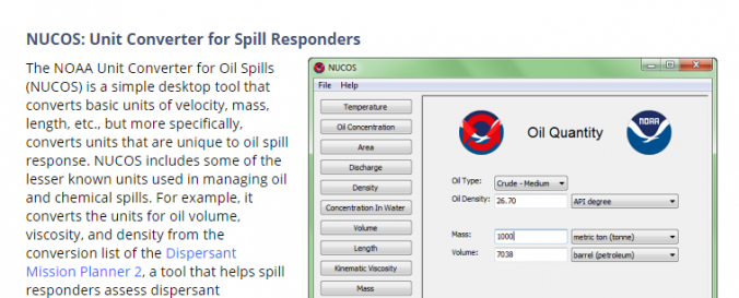 | Space-based Information: | The NOAA Unit Converter for Oil Spills (NUCOS) is a simple desktop tool that converts basic units of velocity, mass, length, etc., but more specifically, converts units that are unique to oil spill response. NUCOS includes some of the lesser known units used in managing oil and chemical spills. For example, it converts the units for oil volume, viscosity, and density from the conversion list of the Dispersant Mission Planner 2, a tool that helps spill responders assess dispersant application system performance. |