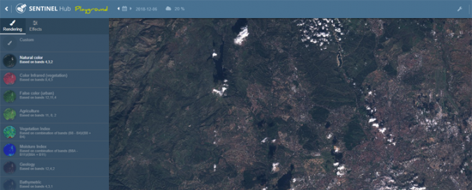 Space-based Information:The Sentinel Hub Playground provides a web GIS to explore satellite imagery from platorms Sentinel-2, Landsat-8 and MODIS. Sentinel and Landsat data can be displayed in a variety of predefined band combinations and spectral indices as they are generated on the fly. Costom band combination can be created by the user. Effects like atmospheric correction or color properties such as gain and gamma are adjustable. Filters allow for a selection of imagery by date of image acquisition and percent cloud cover. The Playground further includes a global digital elevation model. Downloading imagery is free but requires an EO Browser account.