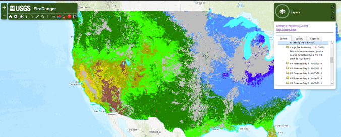 Space-based Information:Vegetation-based fire indicators: expected number of fires per predictive service area: number of fires predicted (1000+ acres west, 500+ acres east) or the coming 7 days, with a probability estimate for exceeding the prediction.