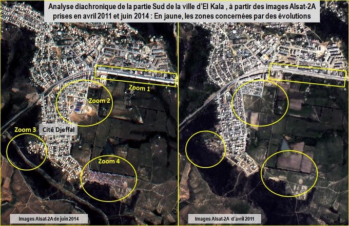 Based on the earth observation satellite imagery, a diachronic analysis using images of Alsat-2A (from two dates: 8 April 2011 and 11 June 2014) was conducted as an effective way of mapping changes in the urban and natural environments. This method of observation highlighted significant changes in construction of infrastructures and dwelling in both cities.