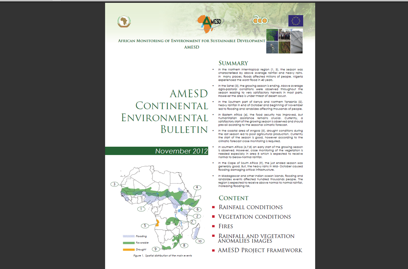 The African Monitoring of Environment for Sustainable Development (AMESD) released a new issue of their Continental Environmental Bulletin for Africa. Based on the analysis of remote sensing imagery and of derived environmental indicators, the publication looks at rainfall conditions, vegetation conditions, fires as well as on rainfall and vegetation anomalies on the African continent. It furthermore addresses the AMESD project framework.