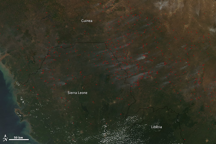 This image was acquired by the Moderate Resolution Imaging Sprectroradiometer (MODIS) on NASA’s Aqua satellite on January 28, 2014 and shows the Sahel region in West Africa in the middle of its burning season. Fires are marked with red points, smoke is easily recognizable.