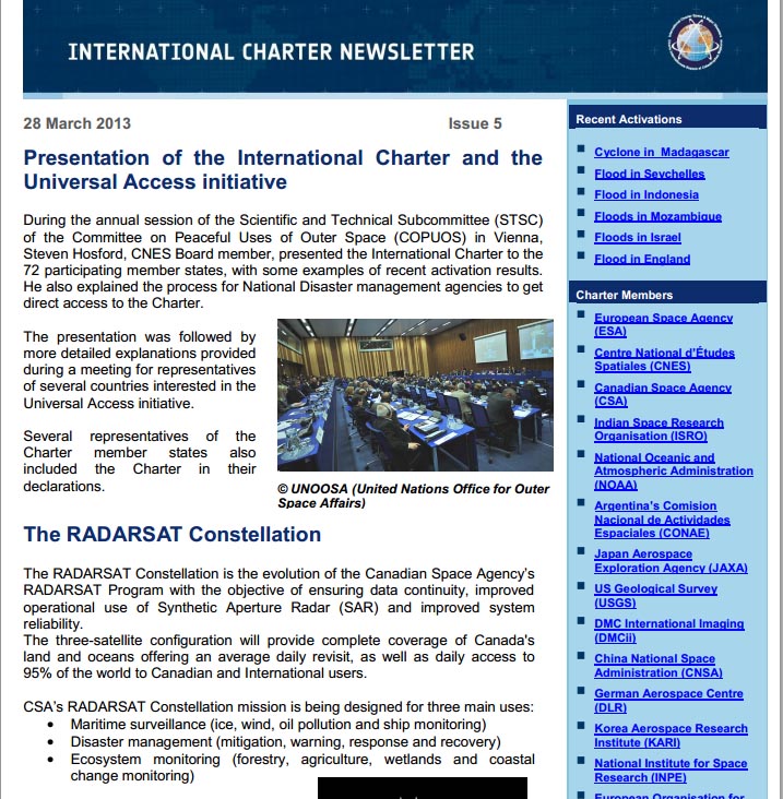 The International Charter "Space and Major Disasters" published the March 2013 issue of their Newsletter, which is available online.