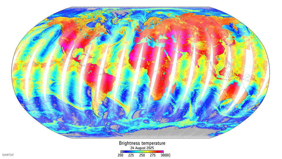 The Microwave Sounder (MWS) and Radio Occultation (RO) instruments are already returning initial data. The MWS provides atmospheric temperature and humidity profiles, combining earlier instruments into a single antenna with new channels for temperature, humidity, and ice-cloud detection. Its resolution has improved from 48 km to 20 km at nadir, with 24 channels that will be combined to generate atmospheric products at different altitudes. Early imagery revealed convective clouds over the oceans, including the swirl of ex-hurricane Erin in the North Atlantic, and summer brightness temperatures over the land and ocean in Europe.