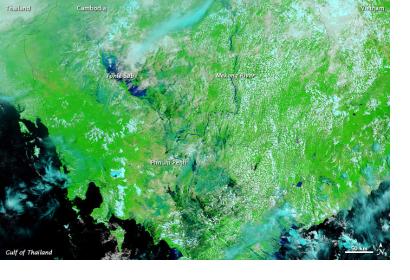 Despite cloud cover, significant changes are apparent along the Mekong River between 2010 and 2011. In 2010, the river is a thin blue line extending southward toward Phnum Penh (Phnom Penh). In 2011, flood water spans kilometers north of the city. Higher water is also apparent south of Phnum Penh, and around Tônlé Sab (Tonle Sap).