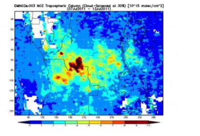 OMI measures NO2 by the number of molecules in a cubic centimeter. The highest concentrations appear in dark red and are coming from extreme northern Angola and south central part of the Democratic Republic of the Congo. The high concentration coming from the DRC appears to look like a butterfly.