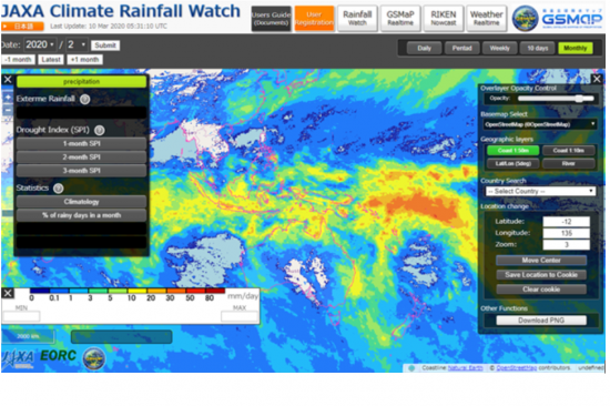 The Japan Aerospace Exploration Agency (JAXA) has released the JAXA Climate Rainfall Watch website to monitor extreme weather and climate over the world. The website provides hourly global measurements of precipitation as well as forecasts about heavy rainfall and drought in different temporal scales (daily, pentad, weekly, 10-days and monthly). The satellite-based global rainfall maps produce highly accurate measurements that can help better understand the changing climate, improve forecasts of extreme weather events, such as floods and droughts, minimize their damage and strengthen early warning systems.