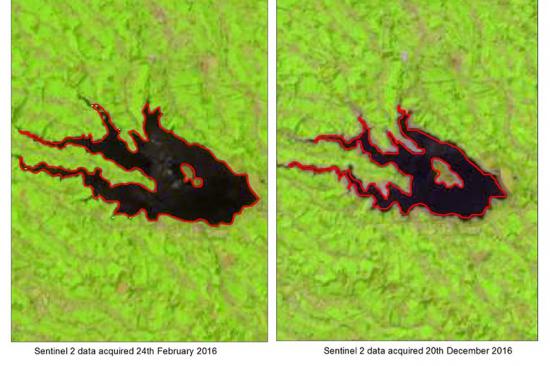 The Regional Centre for Mapping of resources for Development (RCMRD) has assessed the impact of the drought to Ndakaini dam using space technology. They took Sentinel 2 satellite data and analyzed two sets of images from February 2016 and December 2016 to see how the water in the dam has shrunk in the last year. The images show reduction in the surface area of approximately 93ha, which is nearly 35%. These findings are quite alarming, because if the drought continues, the Nairobi county risks a water crisis that might trigger other problems such as an outbreak of water borne diseases.