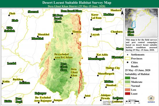 The Space Application Centre for Response in Emergency and Disasters (SACRED) of the Space & Upper Atmosphere Research Commission of Pakistan (SUPARCO), a UN-SPIDER Regional Support Office, is using space-based information to analyze areas with regards to their suitability as desert locust habitats based on vegetation, soil type and other factors. The results support surveillance and control operations by helping demarcate locust-prone areas.