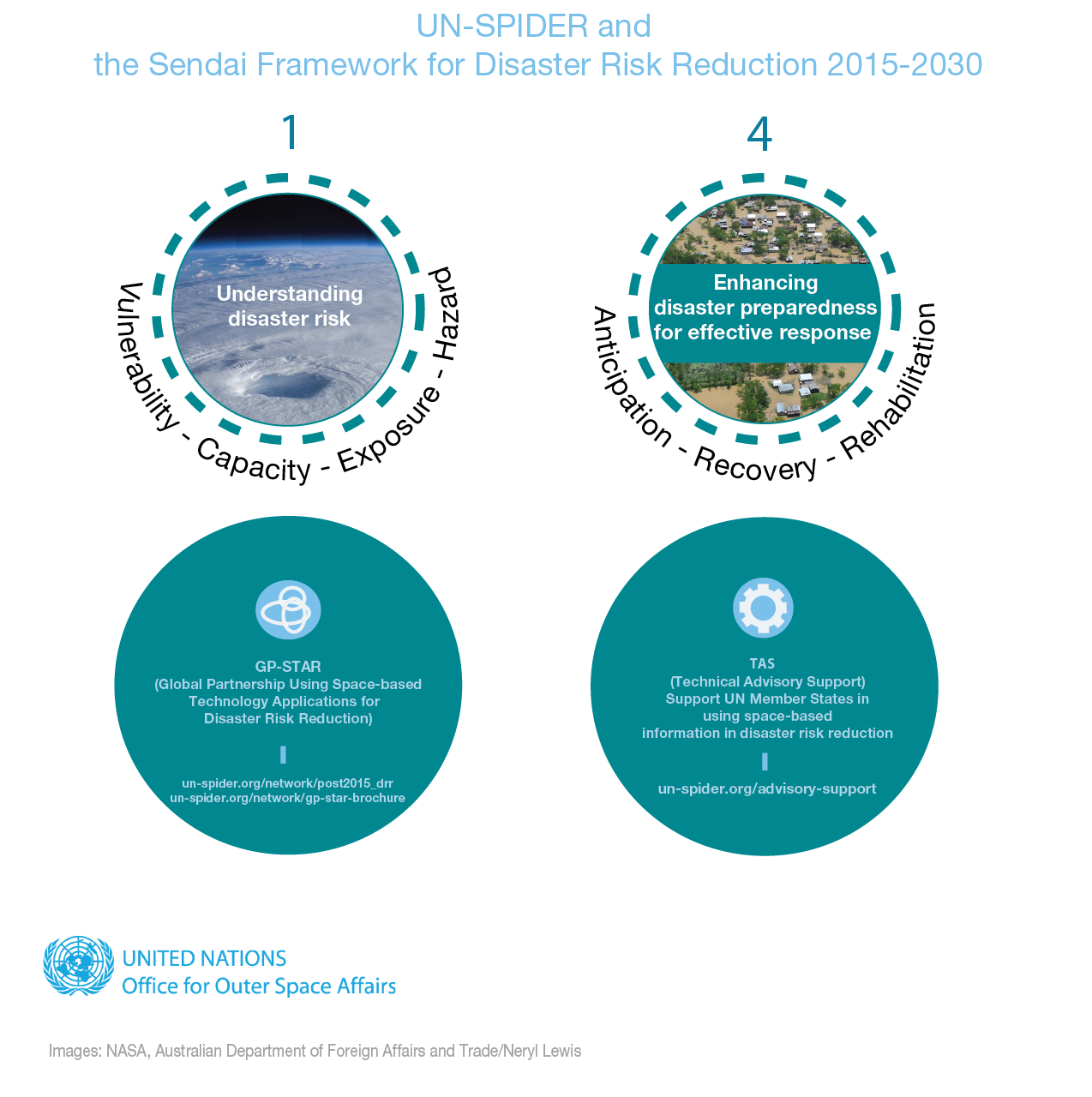 Two examples of how UN-SPIDER facilitates disaster risk reduction and the implementation of the Sendai Framework, especially its priorities for action 1 and 4, are the programme's Technical Advisory Support (TAS) activities and its role in the Global Partnership using Space Applications for Disaster Risk Reduction (GP-STAR) for which it acts as the Secretariat.