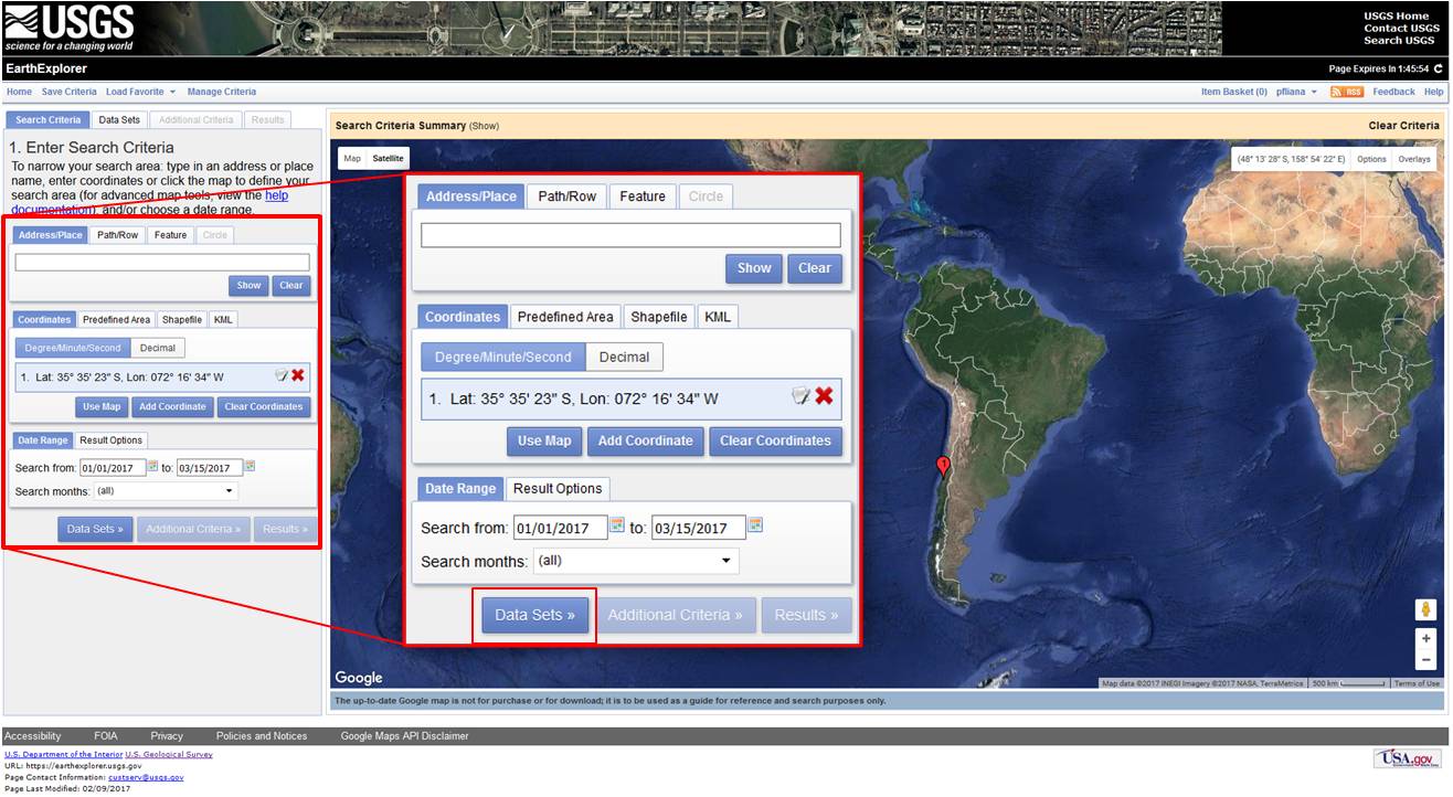 The data range should also be filled out to narrow down the image search to specific dates. For this practice, the data range chosen was from 01 January 2017 to 15 March 2017 (Figure 4). To proceed, click on Data Sets.