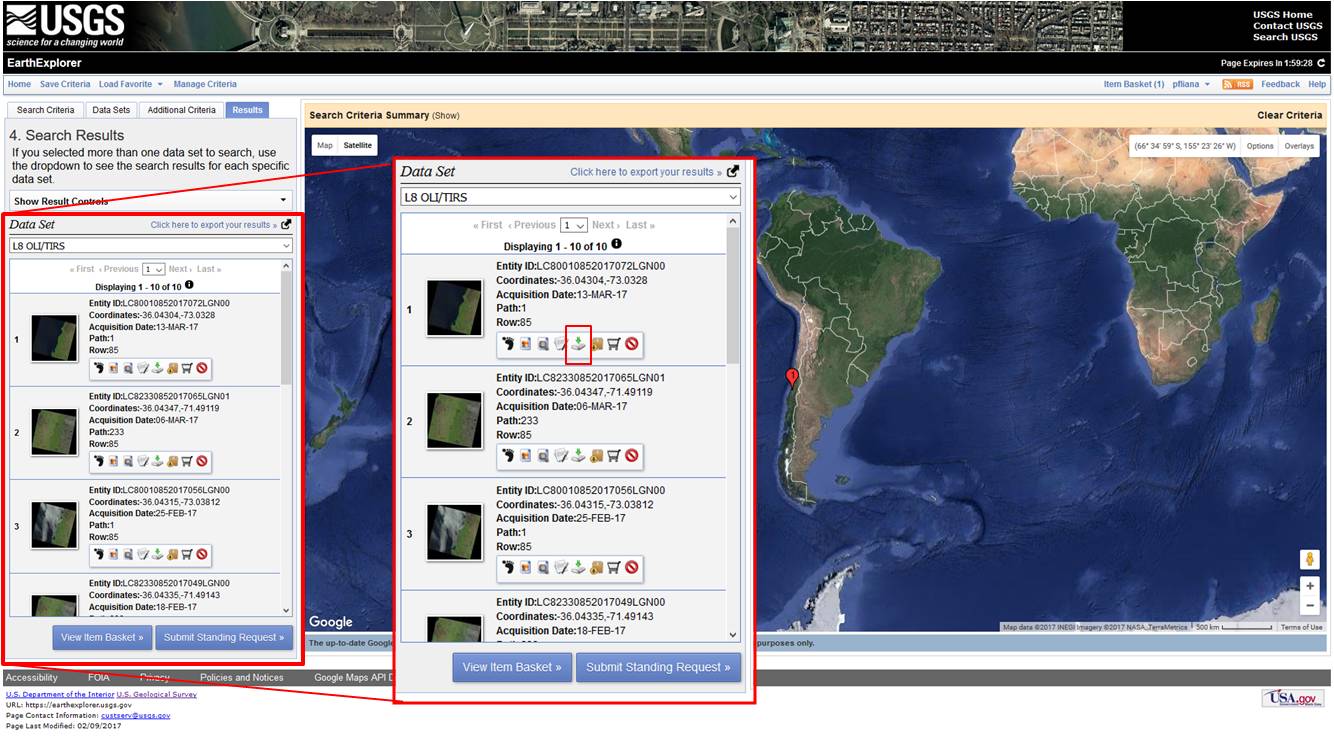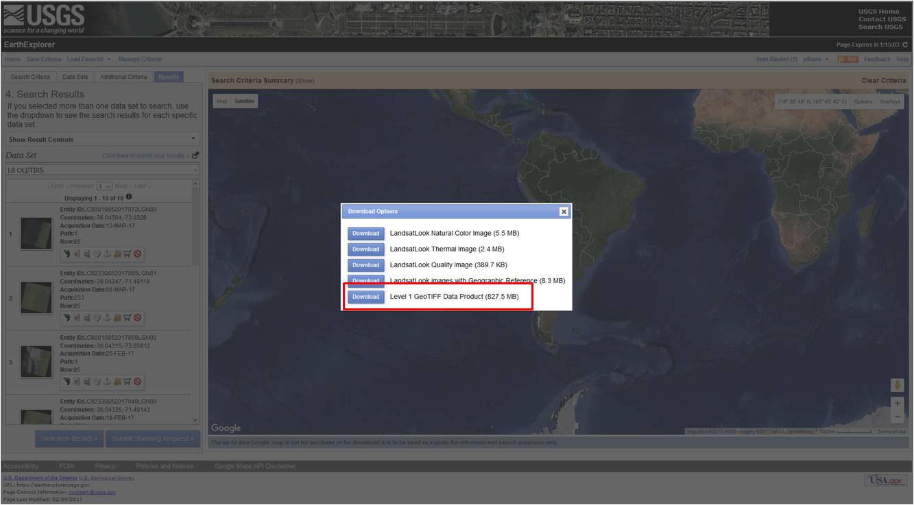 After clicking Results, select the images for download by clicking on the icon highlighted in red in Figure 6. Please note: the search will return images of two different paths from the same row, paths 001 and 233. For this practice, the images used are from path 001. Please download the 08 January 2017 image representing the pre-fire and the 25 February 2017 image, exemplifying the post-fire, i.e. after the fire was extinguished.