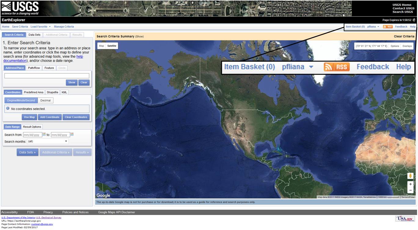Please go back to the USGS website to sign in as a user by clicking the ‘Login’ icon next to the 'Register' icon, on the upper right corner. After logging in, you should see your user name in the top right corner, as shown in Figure 2. In this example, the username is 'pfliana'.