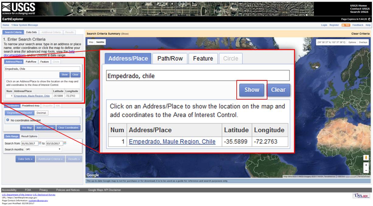 After entering the search criteria for Address/Place as Empedrado, Chile, click show. It will return a search on all addresses and places that match the name typed. Click on the name that matches the searched criteria. During this practice, there was only one place returned by the search, as shown in Figure 3. After clicking on the matching address/place, the website will display where the place is located.
