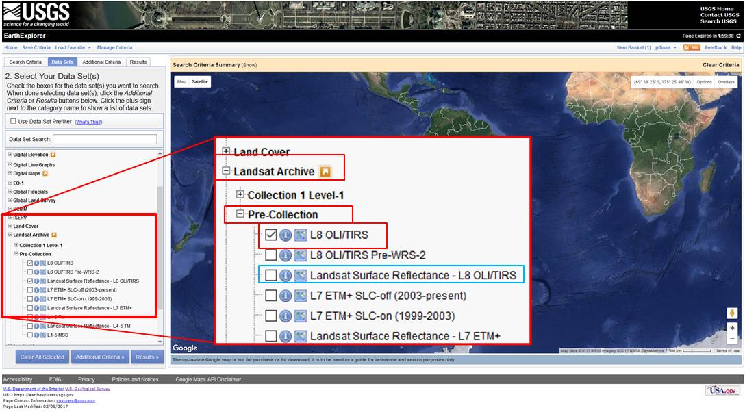 TIP: Any data set(s) can also be searched by name, directly on the Data Set Search box. If you would like a more specific search, please go to Additional Criteria where other options can be selected, such as the sensor ID, data type and cloud cover (percent).